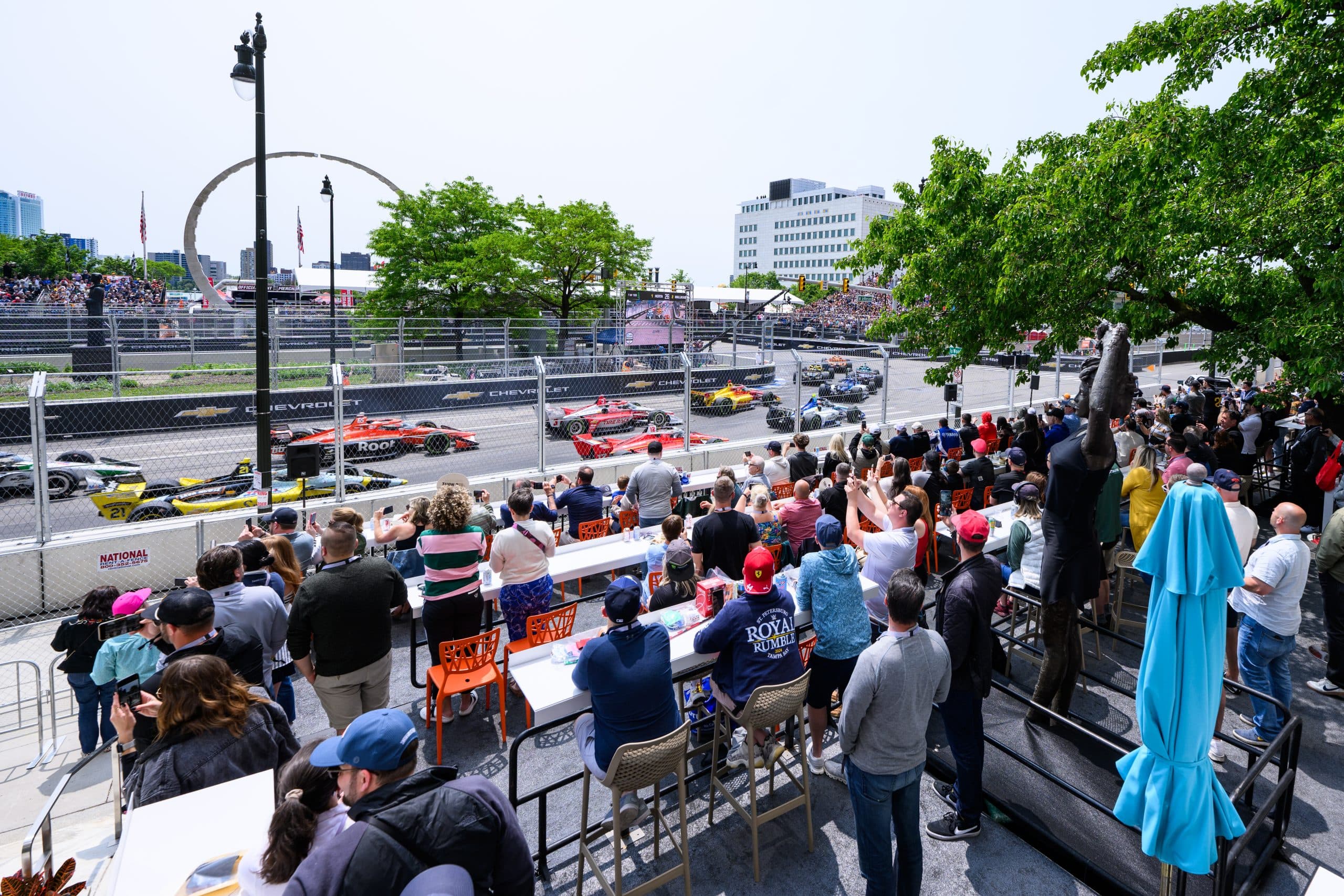 The Detroit Grand Prix is a high-speed spectacle where the world’s most skilled drivers compete on an intense circuit filled with sharp turns, long straights, and electrifying action. Fans gathered at TURN313 both inside the Beacon event space in One Woodward, and on the built-out viewing platform outside Turn 3. The all-day event featured a wide variety of food, dirty soda bar, donut “spare tire” wall, racing simulators, and more!